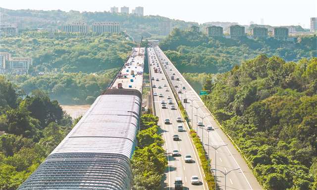 据了解,马鞍石嘉陵江大桥复线桥是渝武高速拓宽改造工程的重要节点性工程,连接渝北区和北碚区,位于现有马鞍石嘉陵江大桥上游一侧。该桥为五跨连续钢构桥,全长1422米,最大跨度达250米,建成后将与现有大桥形成双向8车道,从而缓解既有马鞍石嘉陵江大桥过江交通拥堵情况,对增强成渝地区双城经济圈交通运输活力具有积极作用。目前,渝武高速拓宽改造二标段项目已完成总工程量的77%,预计2026年底完工。