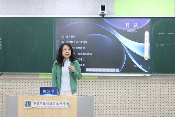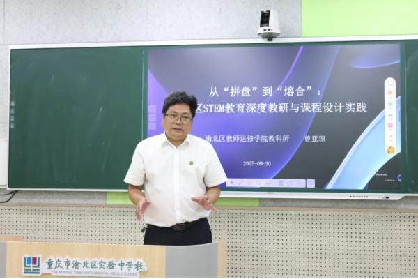随后,渝北区教育学会会长、区教师进修学院教科所所长曾亚琼,以《从“拼盘”到“熔合”:渝北区STEM教育深度教研与课程设计实践》为题作专题讲座。她指出,STEM教育应超越学科“拼盘”,迈向真实情境下的“熔合”,并开发“三维整合模型”:以真实问题为“锚点”的情境设计、以跨学科知识为“内核”的深度融合、以素养发展为“出口”的综合评价,曾亚琼还结合《智慧农场灌溉》等案例,阐释具体实践路径。她建议,通过开展主体化备课、工具化评审与协作化成长来深化教研,推动STEM教育从“亮点项目”走向“常态课程”,成为培养学生创新与实践能力的重要土壤。