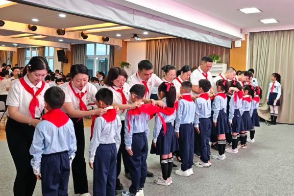鲤鱼池小学党总支书记莫丽红谈道:“红领巾是烈士血与火凝成的火炬,从1949年飘扬至今,整整76个年头。今天佩戴上红领巾,就要在星星火炬指引下勇敢向前。请同学们把‘小我’写进祖国‘大我’,让读书声与心跳声同频,时刻准备着成长为社会主义事业的可靠接班人!”