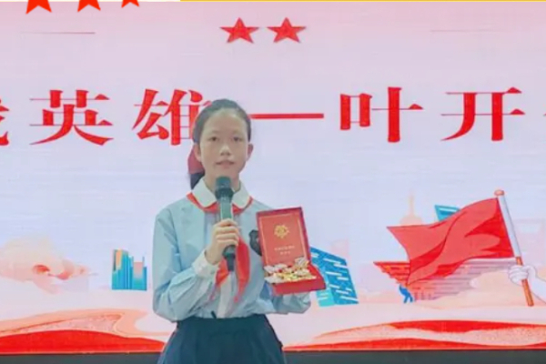 “1969年,当时年仅21岁的叶开全爷爷背情报闯火线,血染军装,立下一等战功……”6.3中队红领巾讲解员毛若冰铿锵有力的话语,让新队员们了解到勋章背后的故事,让信仰在童声里继续燃烧。