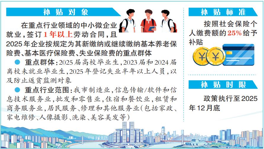 近日,市人力社保局出台《关于加快落实扩大社会保险补贴范围和一次性扩岗补助政策有关工作的通知》(以下简称《通知》),将加快推动扩大社会保险补贴范围和一次性扩岗补助政策落地见效,激励企业扩岗吸纳就业。《通知》明确,按照社会保险个人缴费额的25%给予补贴。
