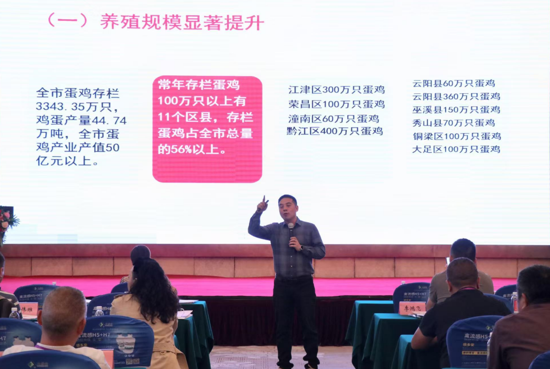 针对面临的挑战,多位行业专家围绕蛋鸡产业热点问题展开研讨。重庆家禽产业专家委员会秘书长谭千洪分析了重庆蛋鸡产业现状与发展建议,西北农林科技大学教授高玉鹏就“蛋鸡大产能形势预判与破局之道”作专题报告。此外,广东温氏大华农、峪口禽业、河南炎黄生物、洛阳惠中生物等企业代表也分别就疫苗免疫、蛋鸡育种、提质降本、联合免疫等议题分享了最新技术与实践成果。