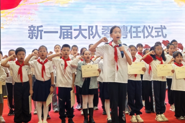在庆祝第76个建队节暨大队委就职仪式上,重庆科学城康居西城小学校全体少先队员齐唱队歌、重温少先队誓词。学校为新一届大队委授予标志、颁发聘书,当选者庄严宣誓,将正式肩负起“服务学校、服务老师、服务同学”的责任,开启少先队工作新篇章。