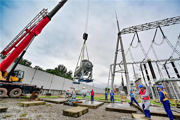 国网重庆超高压公司员工在500千伏玉屏变电站起吊500千伏新GIS断路器。(刘玉峰 摄)