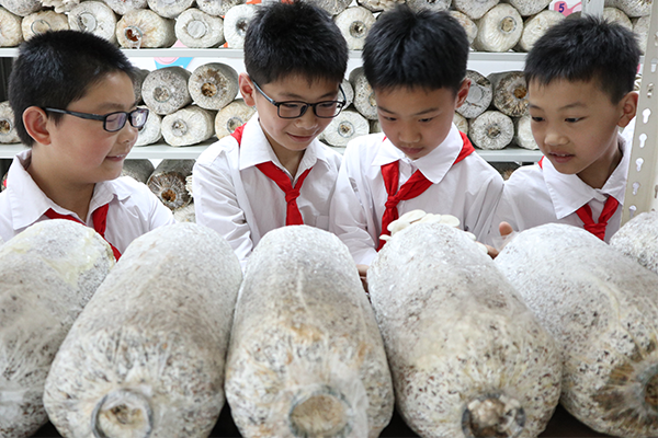 重庆市渝北区兴隆中心小学校开设蘑菇种植课程。