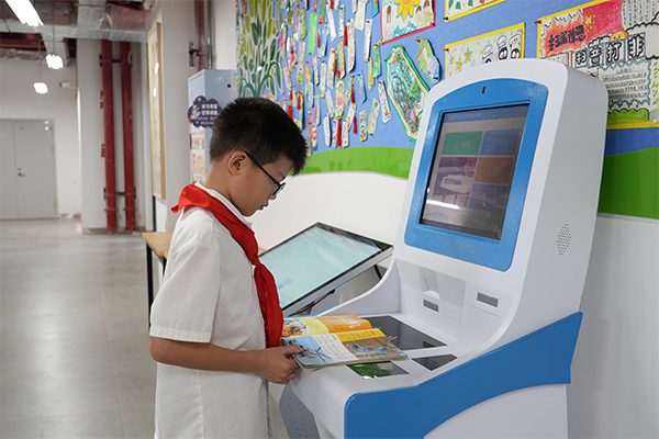 香国小学学子正利用智慧系统进行图书借阅。