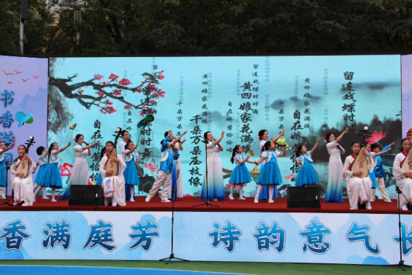 作为学校坚守十载的文化盛宴,本届诗词大会以“融汇传统,创新未来”为核心,延续“每天都上一个新台阶”的办学理念,构建了兼具知识性与趣味性的赛事体系。活动在气势恢宏的器乐合奏《云宫迅音》与十周年诗歌诵读中拉开帷幕,全校师生齐诵《四时读书乐》《七律长征》等经典篇目,稚嫩而坚定的声音响彻校园,展现出融创学子对诗词的赤诚热爱。
