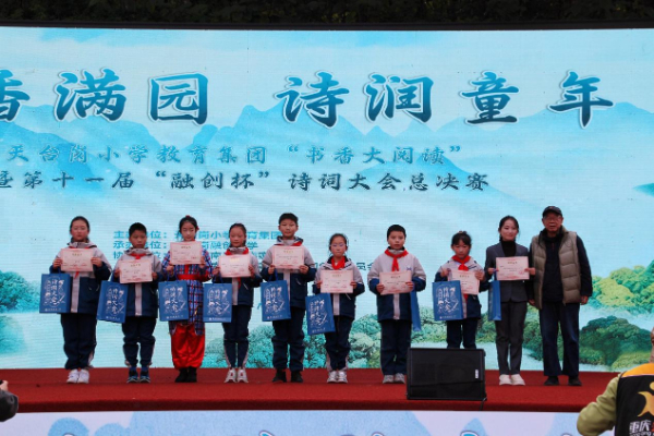 天台岗融创小学校长徐勇在致辞中强调,诗词是中华文化的基因密码,学校始终以诗词教育为传统文化传承的核心载体,通过“文化长廊”“书香校园”“亲子共读”等多元举措,让经典浸润成长,寄语同学们要以诗为伴、传承经典、不负韶华。中国当代著名诗人、词作家李尚朝则以“少年情怀总是诗”为赠言,鼓励同学们在诗词中汲取勇气与力量,保持纯粹好奇的童心与意气风发的朝气。