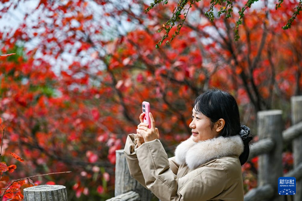 11月23日,游客在巫峡·神女景区观赏、拍摄红叶美景。新华社记者王全超摄