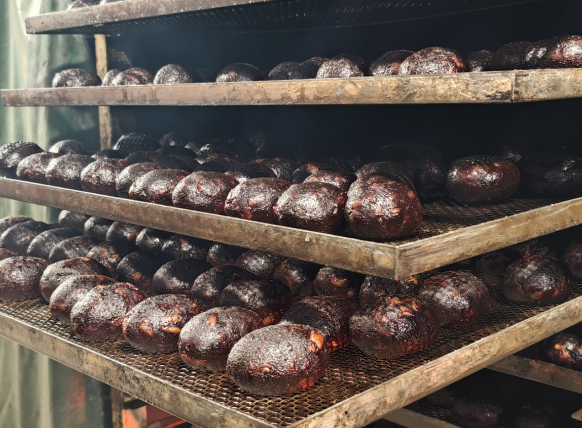 “祖辈传下的配方不能丢,现代化的生产效率必须提。”加工厂负责人李开勤的话语,道出了产业蜕变的核心逻辑。在生产车间内,部分工序实现机械化运转,而关键的“揉团”环节仍延续传统技艺,工人师傅凭借多年经验把控力度,确保每颗血豆腐形状匀称、紧实适度。经过5天精准控温烟熏后,成品通过自动化封装线完成打包,月产能已稳定达到1.8万斤,既保留了传统风味,又实现了品质标准化。