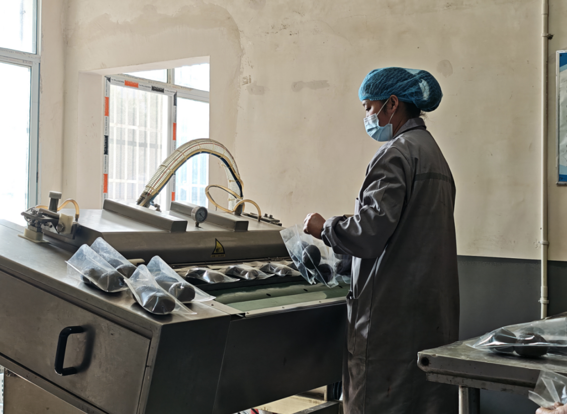 工人正在车间对血豆腐进行真空包装。(谢伟 摄)