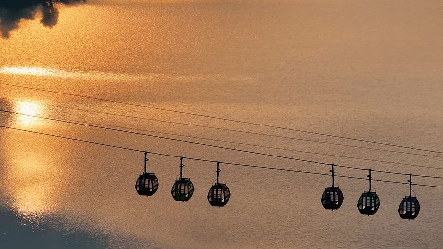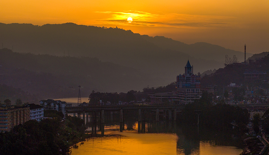 当日傍晚,夕阳缓缓沉入江对岸山影,将天空晕染成层层金红,香溪廊桥、彩色酒店及游乐设施裹上鎏金外衣,与粼粼江面相映成趣。