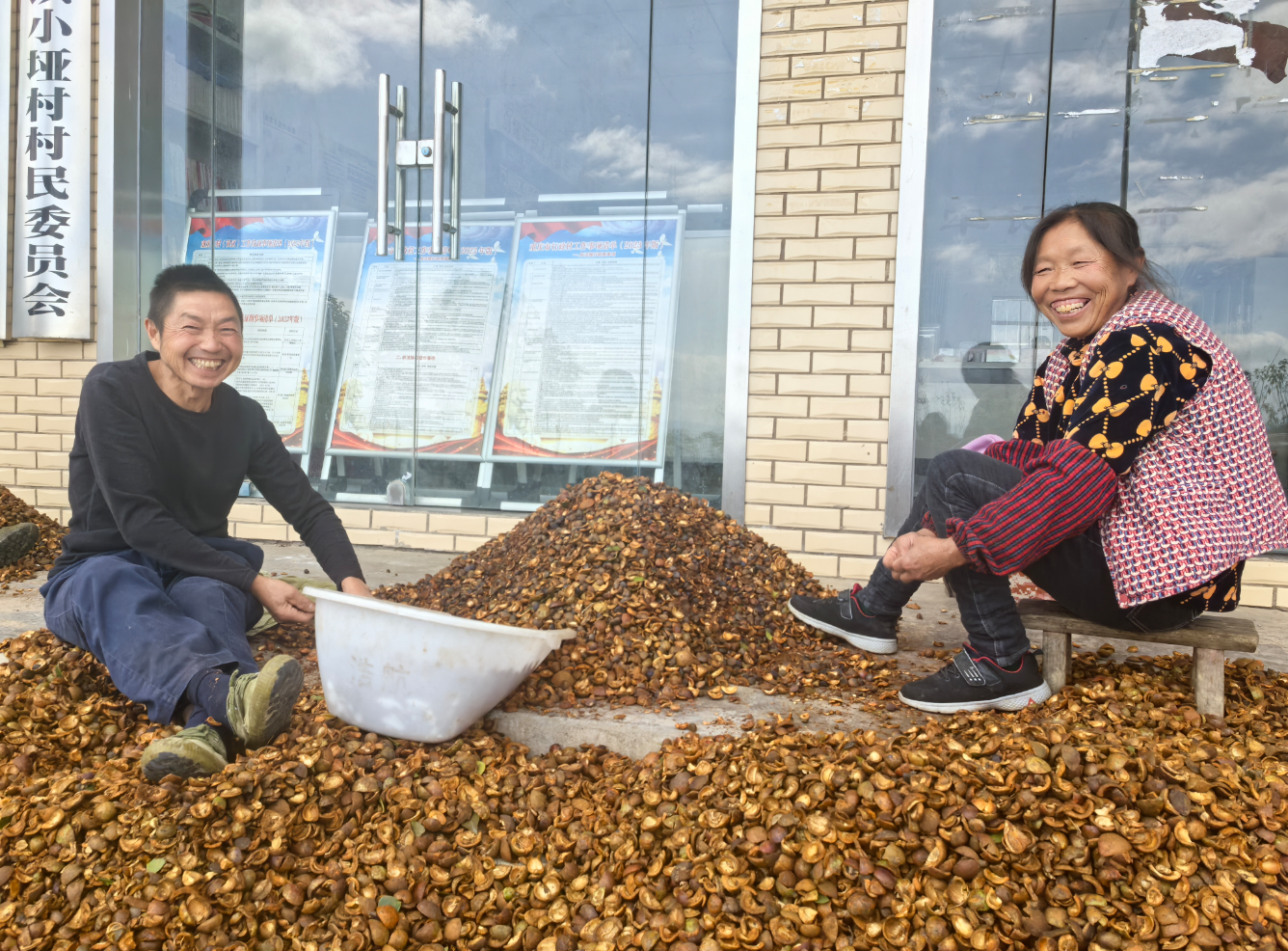 村民们对新鲜采摘的油茶果进行晾晒、分拣、脱壳。