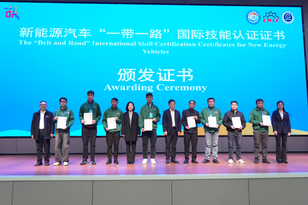 现场颁发新能源汽车“一带一路”国际技能认证证书。
