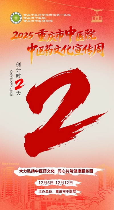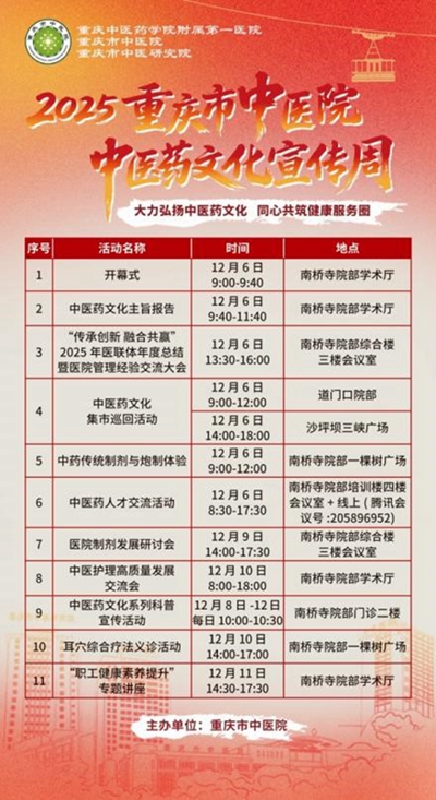 2025年12月6日,诚邀广大市民朋友前往渝中区道门口院部(上午9:00-12:00)和沙坪坝区三峡广场(下午14:00-18:00),共赴一场内容丰富、体验感强的中医药文化之约,共同感受中医药的独特魅力与时代价值。(文芝丹)
