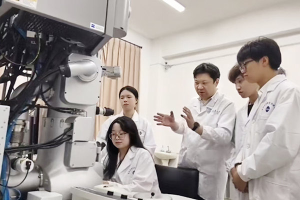 实验室里,团队在徐皓老师的指导下使用电子显微镜观察材料微观组织。