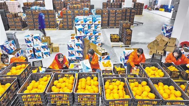 12月8日,秀山县洪安镇乡村振兴产业示范园,工人们正在打包脐橙。
