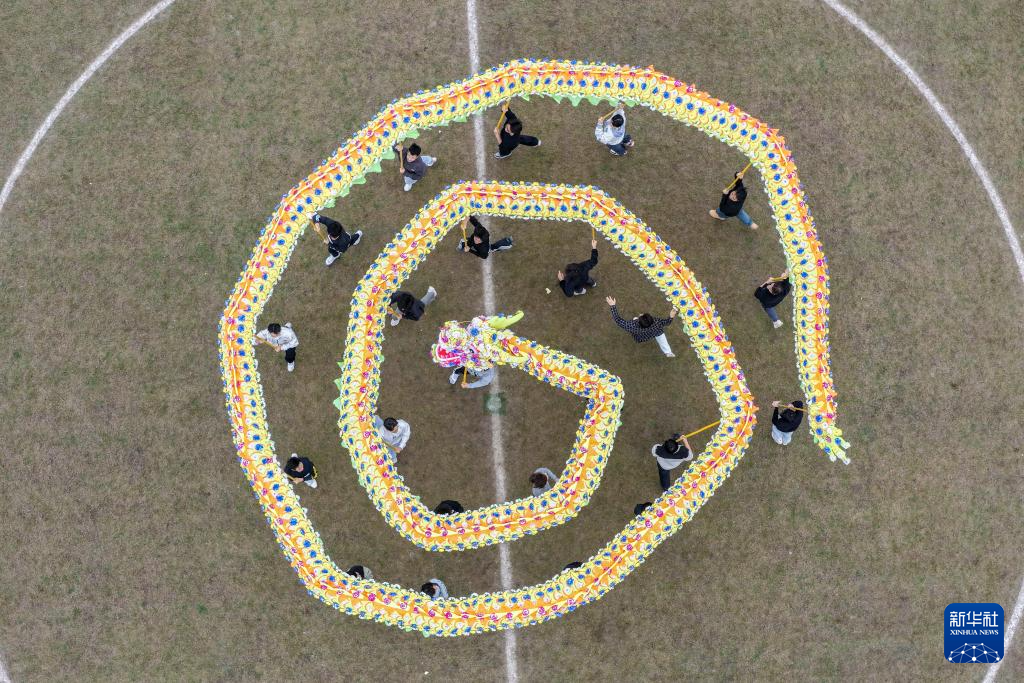 12月6日,重庆铜梁龙艺术团竞技舞龙队队员在“渝超”赛场排练(无人机照片)。新华社记者 黄伟 摄