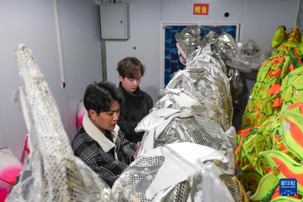 12月6日,在铜梁区玄天湖龙舞广场,重庆铜梁龙艺术团竞技舞龙队队员魏烨(左)、秦新松在演出前检查表演道具。新华社记者 黄伟 摄