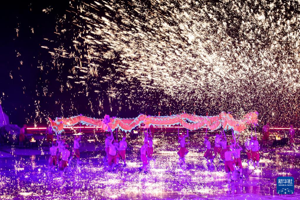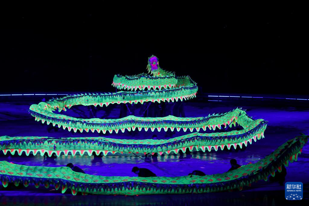 这是12月6日在铜梁区玄天湖龙舞广场拍摄的《追梦·铜梁龙》演出现场。《追梦·铜梁龙》融合水云龙、荷花龙、铁花火龙等多样龙舞。新华社记者 黄伟 摄