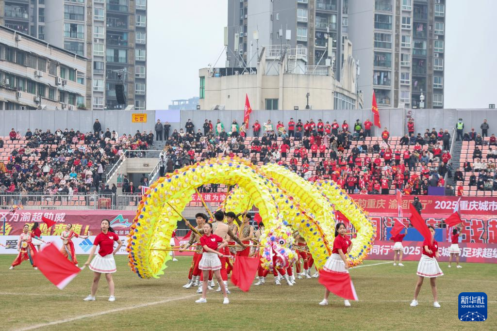 12月6日,重庆铜梁龙艺术团竞技舞龙队队员在“渝超”赛场进行暖场表演。新华社记者 黄伟 摄