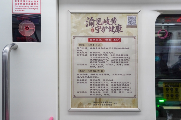 走进专列车厢,浓郁的中医药文化氛围扑面而来。扶手、车厢壁等醒目位置,通过图文并茂的形式精心呈现重庆道地药材“渝十味”、国家级传统医药类非遗项目、古代名医典故、节气养生常识、巴渝特色药膳食谱及经典养生疗法等内容,系统展现巴渝中医药文化的独特魅力。为增强互动体验,车厢内还设置了专属二维码,乘客扫描后即可聆听中医药科普专栏,实现从“视觉阅读”到“视听沉浸”的立体体验升级,让专业的中医药知识以更通俗、更生动的方式触达群众。