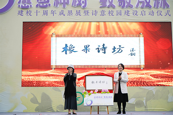 为扎实推进“诗意校园”建设,让诗歌的种子在孩子心中生根,学校正式创立“橡果诗坊”,并聘请重庆市作家协会荣誉副主席李钢、重庆市作家协会副主席钟代华等9位诗人担任高级顾问,现场颁发聘书。诗人、福建省厦门市文学艺术界联合会主席舒婷受邀为“橡果诗坊”揭牌。杨敏表示,期待这些“种诗者”成为学校诗意教育路上的宝贵“引路人”。