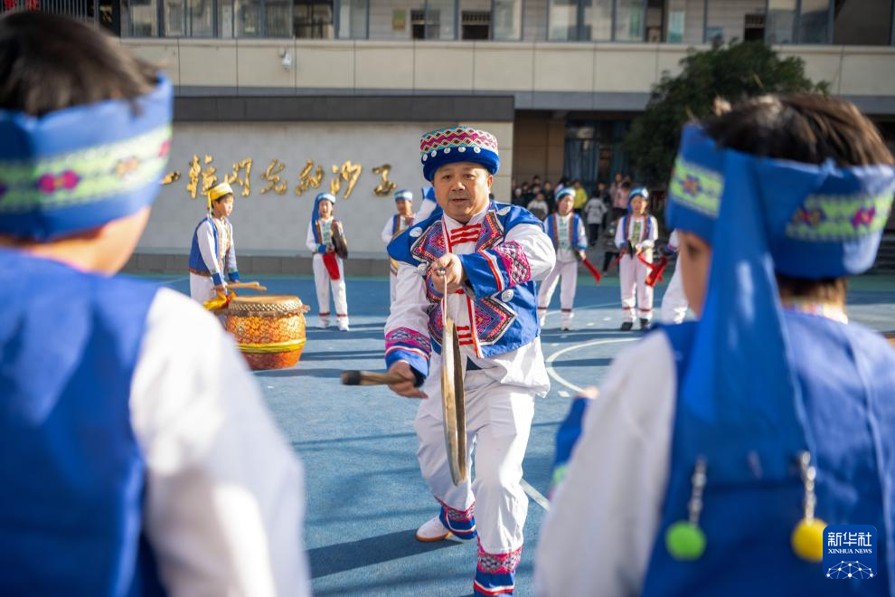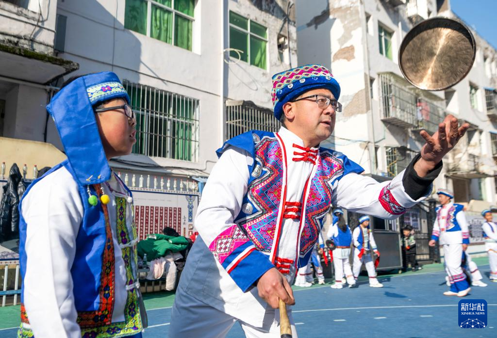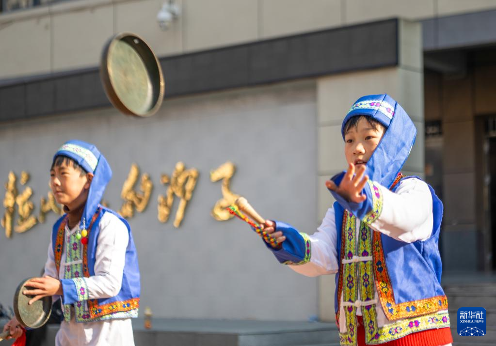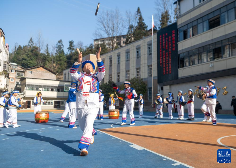 1月9日,非遗代表性传承人在石柱县沙子镇中心小学给学生演示“丢马锣”技艺。新华社记者 唐奕 摄