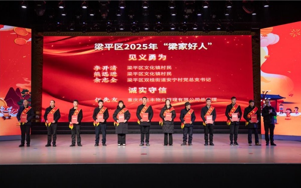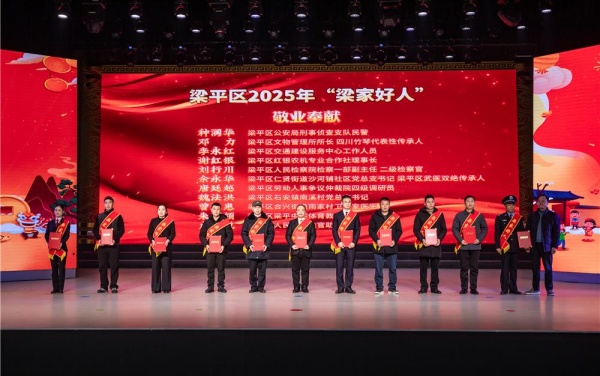 “愿大家在新的一年里身体健康、阖家幸福,愿我们的家乡梁平越来越好!”重庆好人罗成凤、涂小东及中国好人刘联安、邓巧林登台送上新春祝福,质朴的话语里满是对生活的热爱、对家乡的期许,为现场增添了浓浓的暖意。