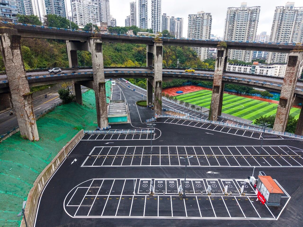 双峰山支路停车场项目位于重庆市南岸区融侨路旋转桥下,紧邻南开(融侨)中学,主要利用桥下闲置空间解决周边居民和学校等停车难问题,项目投资约400万元,项目设计实施面积11541平方米,分3层设置停车场,设计停车位183个,配备了充电桩等新能源汽车配套设施。目前,该项目正在进行收尾绿化等工程,预计今年2月初正式对外开放运营。