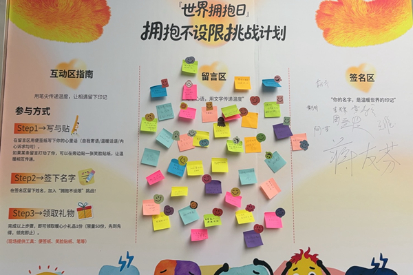 1月21日,线下主场活动在重庆三一八医院举行。身着兔子玩偶服的工作人员主动向过往市民、就诊患者及家属伸出双臂,传递无差别的温暖。现场设置的“抱抱墙”与“留言签名墙”成为热门打卡点,不少人在抱抱墙前合影留念,留言墙上则写满参与者对拥抱的理解与祝福。主办方还准备了定制纪念品,鼓励公众勇敢表达情感、留存温暖记忆,吸引了众多人士前来互动。