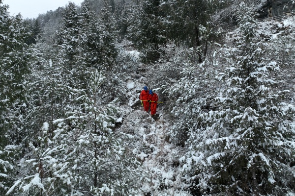 当天,队员们携带红外测温仪、无人机等专业装备,奔赴各覆雪线路区段巡查。在承担“西电东送”重任的±800千伏祁韶线巫山段,大家顶着重雪、脚踩湿滑路面,逐基排查杆塔基础与线路覆冰隐患。针对山区地形复杂、人工巡检有盲区的问题,服务队启用无人机开展空中巡线,通过高清影像实时回传,精准掌握线路运行状态,确保巡线无死角。