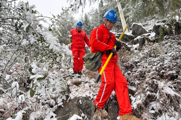 1月20日,国家电网重庆电力(巫山)红岩共产党员服务队对覆雪区域开展巡视。(肖玉建 摄)
