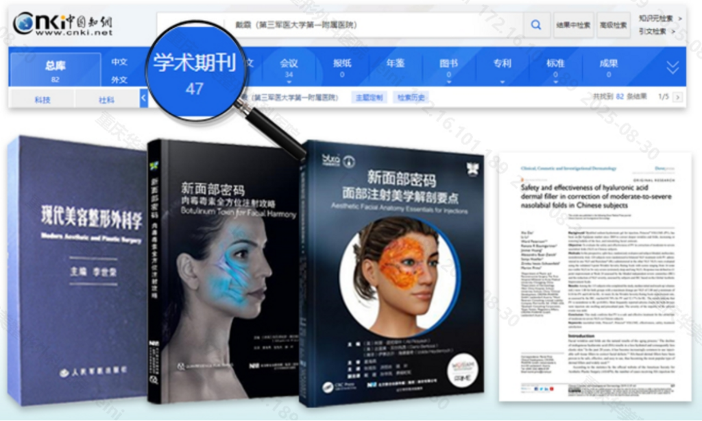 戴霞博士的学术贡献同样耀眼:47篇医学研究成果,1篇SCI学术论文,4部整形临床著作,参编、参译《现代整形美容外科学》《新面部密码:面部注射美容解剖要点》《新面部密码:肉毒毒素全方位注射攻略》等国内外教科书级医学著作,参与撰写《中国人群下面部与颈部年轻化治疗专家共识》。