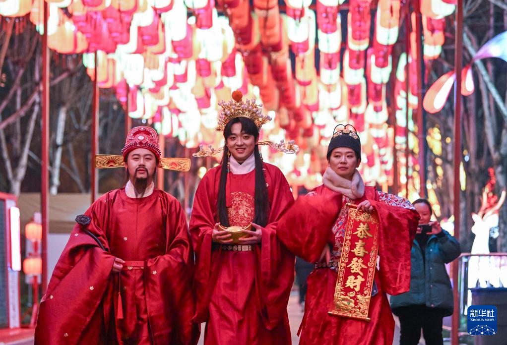 1月30日,重庆市园博园水上灯会现场,景区工作人员(前右)在现场与游客互动。