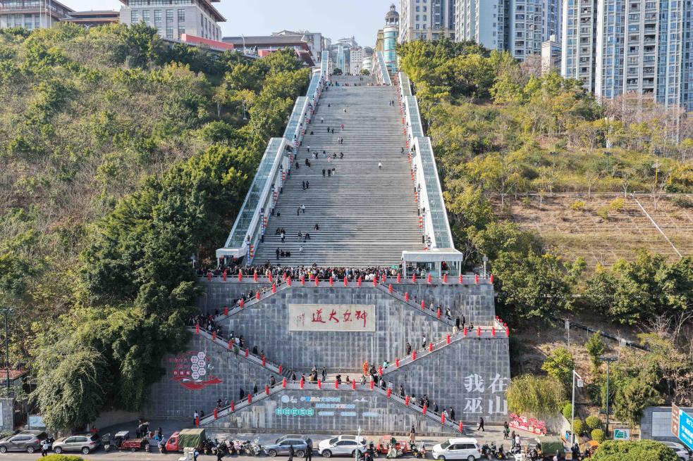2月12日,市民前来体验巫山县“神女大扶梯”。新华社记者 陈诚 摄