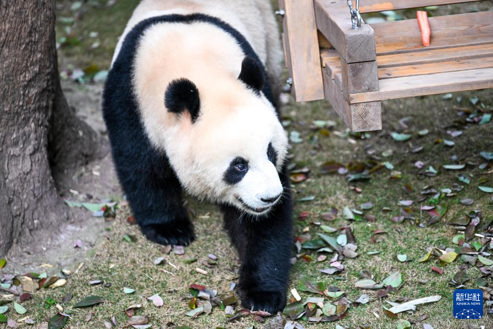 2月24日,大熊猫在户外玩耍。新华社记者 唐奕 摄