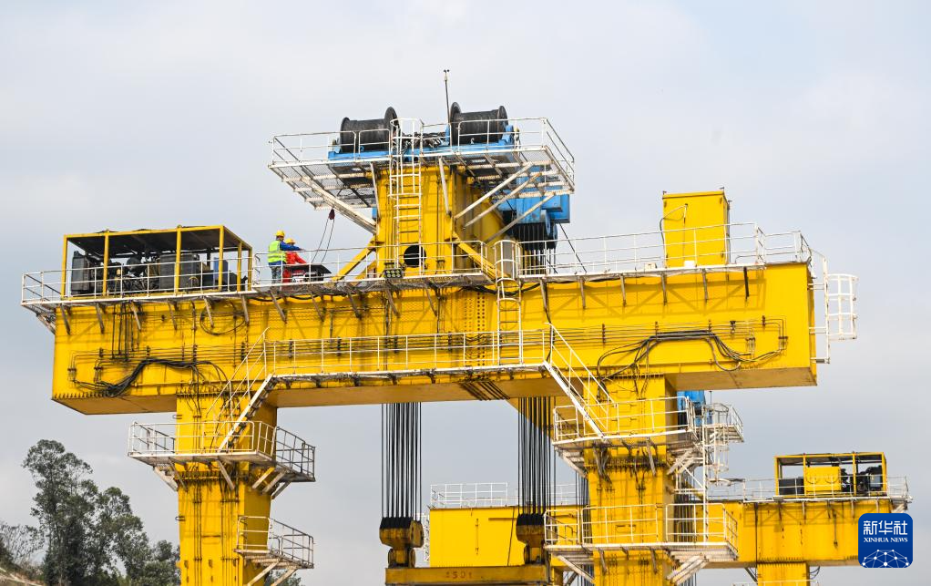 2月26日,在西渝高铁合川东制梁场,工人在提梁机上进行作业前的准备工作。新华社记者 唐奕 摄