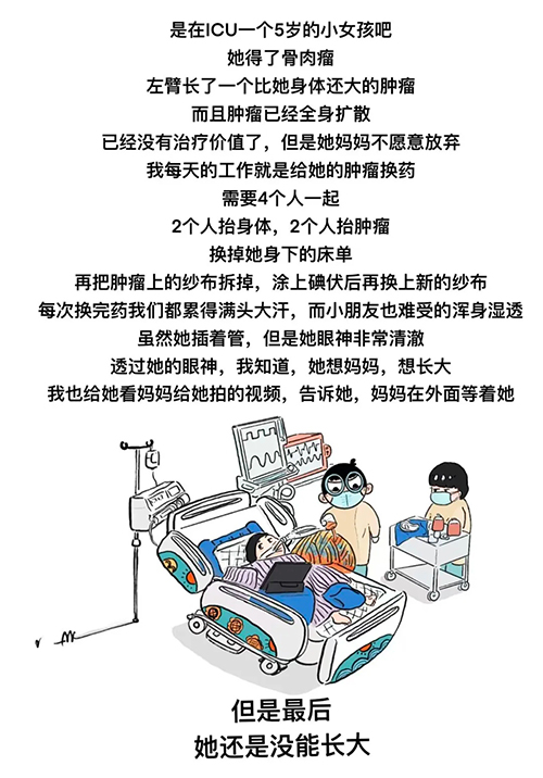 病房里,幸运并不会眷顾每一位小天使,也有“不能长大”的遗憾。一双渴望的眼睛,至今仍深深印在胡光阳的脑海里。曾经有一个5岁的小朋友得了骨肉瘤,左臂长了一个比她身体还大的肿瘤,且已全身扩散。从医学上来说,已经没有治疗价值了,但孩子妈妈始终不愿放弃。胡光阳的工作就是每天给这个孩子换药,每次都需要4个人配合,2个人抬孩子的身体,2个人托着肿瘤。每次忙完,4名医护人员常常满头大汗,孩子也特别难受,但眼神却格外清澈,水灵灵的大眼睛似乎总在问:“叔叔,我能长大吗?”“我也想体验你说的‘无聊的生活’。”和电影《送你一朵小红花》的结局一样,这个小朋友最终没能抵挡住病魔的侵袭。