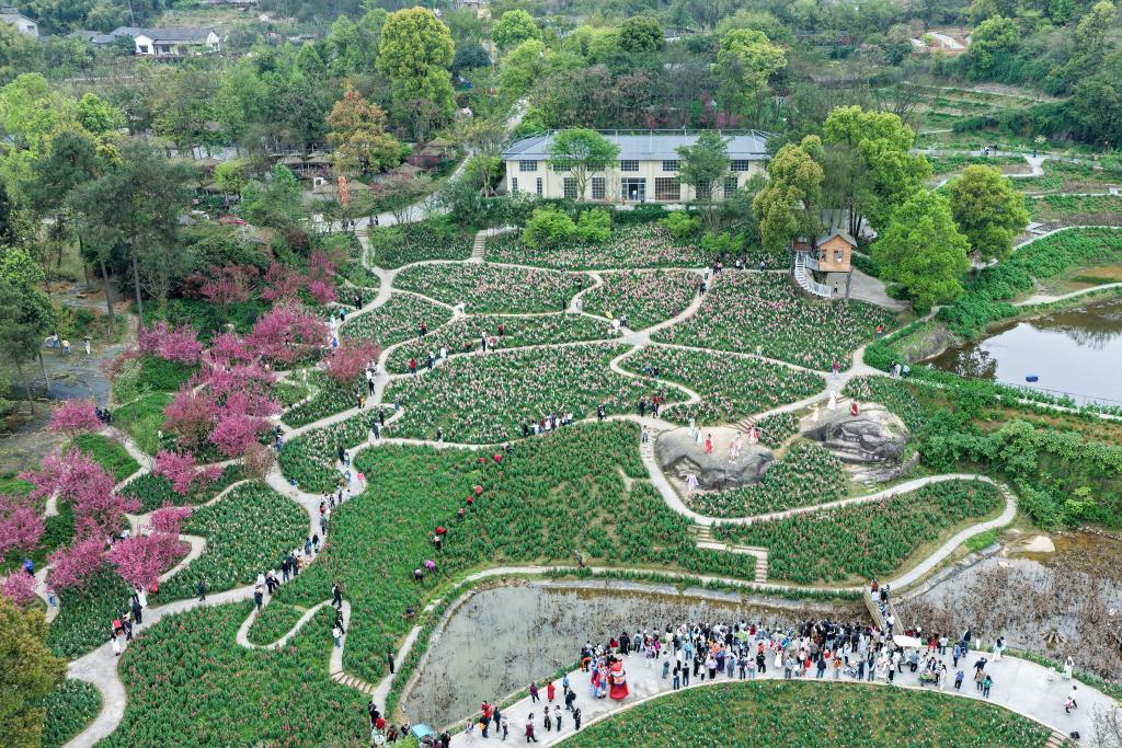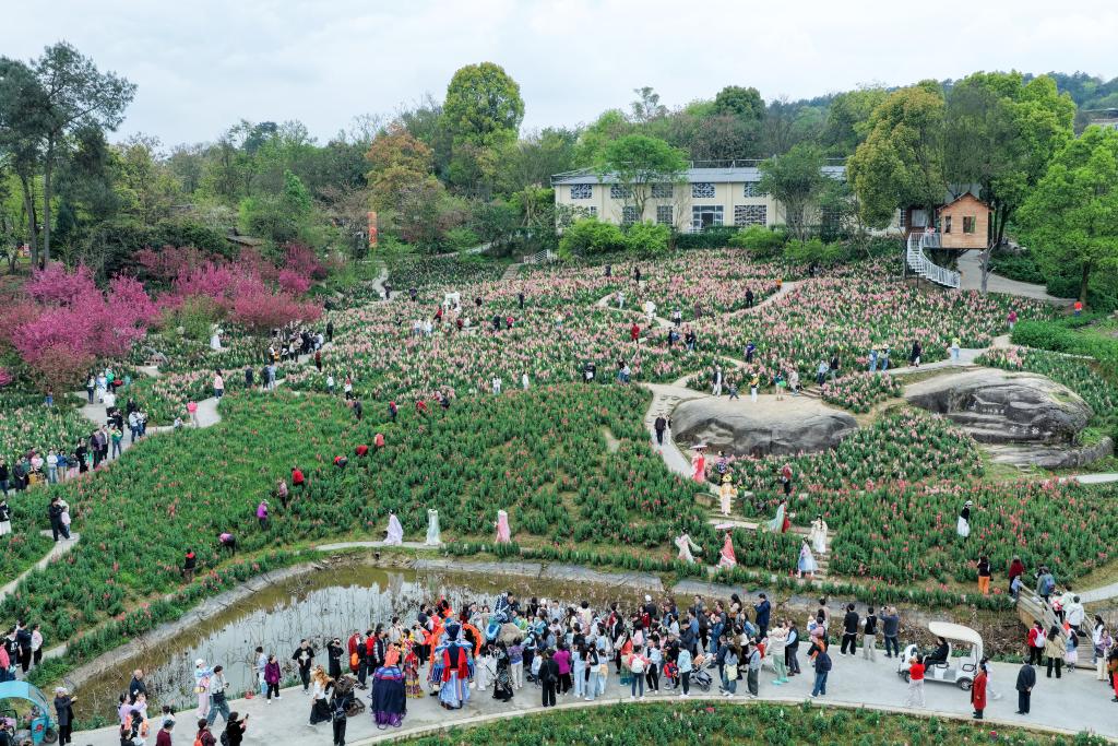 3月22日,游客在重庆市巴南区二圣镇集体村云林天乡景区踏青游玩(无人机照片)。新华社记者 黄伟 摄