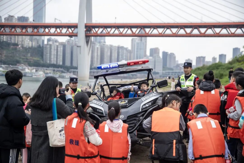 江面上,一场精彩的水上实战演示同步开展。高速快艇编队破浪前行,展现出娴熟的水上驾驶与巡防技能;无人机搭载云台相机和救生设备精准开展模拟搜救,无人救生艇快速抵近目标水域,飞行救生圈精准投放……一系列“科技+守护”的实战展示,让“小记者”们切身感受到重庆水警守护水域安全的专业能力与责任担当,现场掌声、惊叹声不断。
