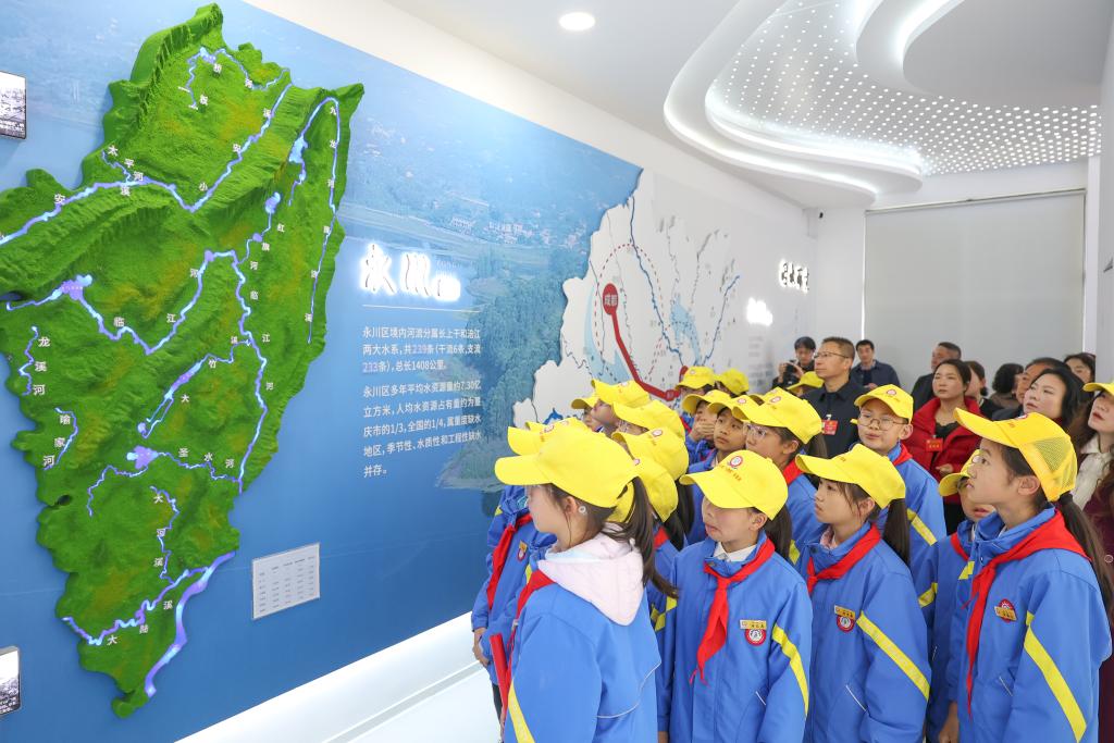 3月20日,在重庆市永川区临江河水文化展示馆,红河小学“小黄帽”志愿服务队的同学和部分巡河代表在了解永川水系分布。