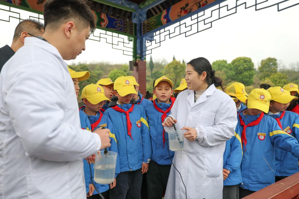 3月20日,在重庆市永川区神女湖边,工作人员现场教红河小学“小黄帽”志愿服务队的同学体验水质检测流程。