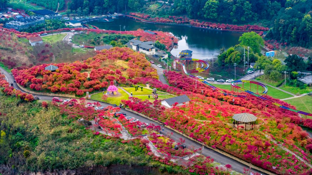 新华网重庆3月25日电(彭博)近日,重庆市巴南区南湖多彩植物园与安澜松木咀红枫园的红枫林进入观赏季。数万株红枫在春风中尽染红颜,漫山遍野如霞似锦,与碧波荡漾的南湖相映成趣,构成“绿水衬红叶”的春日画卷,吸引众多市民游客前来打卡。