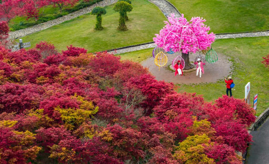 满目如霞的红枫与青山绿水相映成趣,让人仿若置身春日画卷。刘纪湄摄