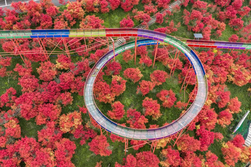 游客们正在红枫盛开的植物园内游玩。刘纪湄摄