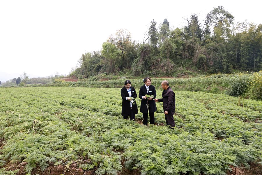 曾令孝向农行大足支行客户经理介绍川芎目前的生长情况。王彩玲 摄