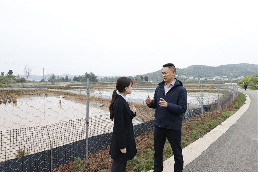 农行重庆大足支行客户服务经理到稻田基地了解情况。王彩玲 摄