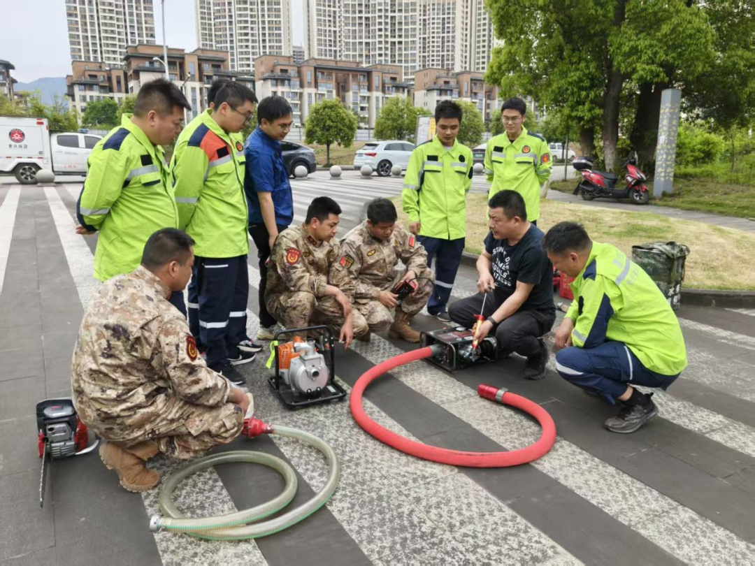 草街街道应急救援队员学习消防水泵使用方法